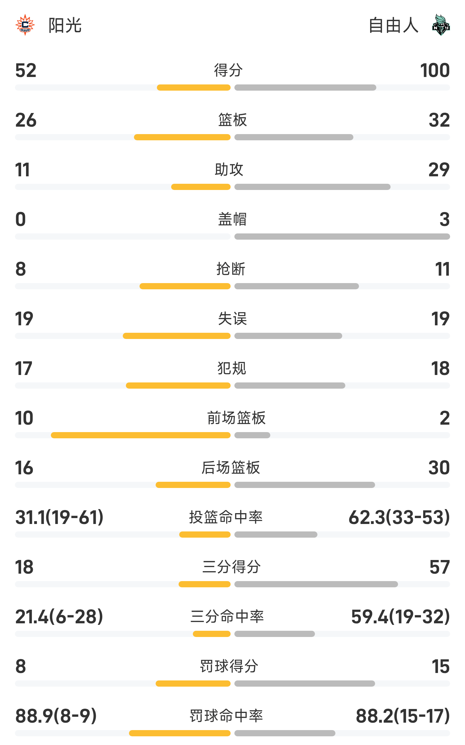 06月02日讯 25赛季WNBA 常规赛,自由人对阵阳光。双方全场战罢,自由人100-52战胜阳光。约内斯库砍下全场最高的18分2板5助,率领自由人成功取胜。